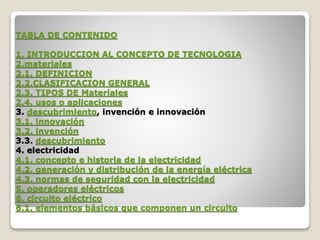Este documento presenta información sobre conceptos de tecnología e incluye secciones sobre materiales, descubrimiento, innovación, electricidad, operadores eléctricos y circuitos eléctricos. Define conceptos como materiales, clasificación de materiales, tipos de materiales, y sus usos. Explica la diferencia entre descubrimiento, innovación e invención. Incluye detalles sobre la historia y generación de electricidad, y normas de seguridad eléctrica. Por último, describe los elementos básicos de un circuito eléctrico