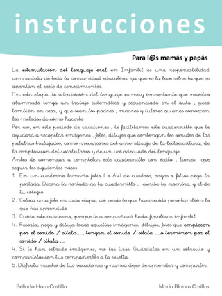 Este documento proporciona instrucciones para un cuadernillo de estimulación del lenguaje oral en Infantil. Se enfatiza que el desarrollo del lenguaje es responsabilidad compartida y debe trabajarse sistemáticamente tanto en el aula como en casa. El cuadernillo ayudará a los niños a recopilar imágenes relacionadas con los sonidos y sílabas trabajados como precursores de la lectoescritura. Se proveen instrucciones para completar el cuadernillo y anexos con articulemas y silabarios para recortar