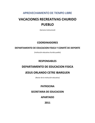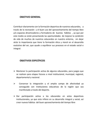 Este documento describe un evento deportivo recreativo para estudiantes que se llevará a cabo durante las vacaciones. El evento es organizado por el Departamento de Educación Física y el Comité de Deportes de una institución educativa y busca promover el deporte y el aprovechamiento del tiempo libre entre los estudiantes. El presupuesto total para el evento es de 5,5 millones de pesos.