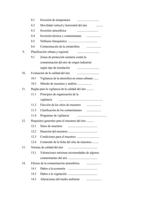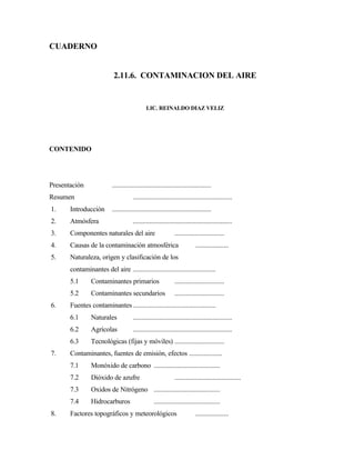 Este documento trata sobre la contaminación del aire. Explica los componentes naturales del aire, las causas y fuentes de la contaminación atmosférica, y clasifica los contaminantes primarios y secundarios. También cubre temas como la evaluación de la calidad del aire, los efectos de la contaminación, y medidas para prevenir y controlar la contaminación atmosférica. El objetivo general es proporcionar información técnica sobre prevención, vigilancia y control de la contaminación del aire.
