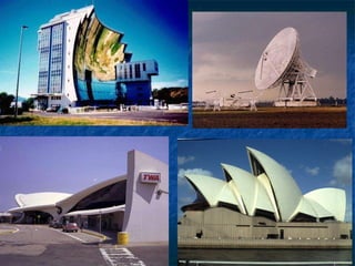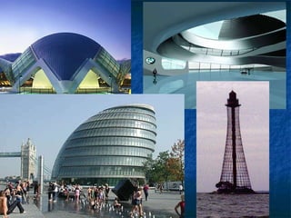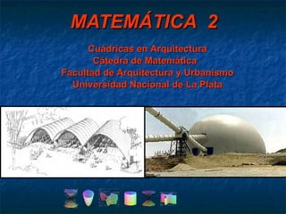 Este documento presenta diferentes formas geométricas como la esfera, elipsoide, hiperboloide de una y dos hojas, paraboloide elíptico, paraboloide hiperbólico y cilindros que se han utilizado en arquitectura. Incluye ejemplos concretos de obras arquitectónicas de todo el mundo que han empleado estas formas cuádricas, como catedrales, auditorios y edificios públicos. El documento también reconoce la influencia del arquitecto mexicano Felix Candela y