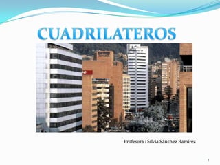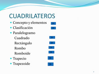Este documento clasifica y describe los diferentes tipos de cuadriláteros. Los cuadriláteros se dividen en paralelogramos (cuadrado, rectángulo, rombo, romboide), trapecios (trapecio escaleno, isósceles, rectangular) y trapezoides (asimétrico, deltoide). Cada figura se define por la presencia o ausencia de lados y/o diagonales paralelas, perpendiculares o de igual longitud.
