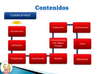 Este documento presenta una lección sobre cuadriláteros para estudiantes de 2o año de secundaria. Explica la definición, propiedades y clasificación de cuadriláteros en trapecios, paralelogramos, rectángulos y cuadrados. Incluye ejemplos de construcciones geométricas y ejercicios prácticos para evaluar el aprendizaje.