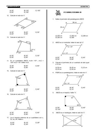 Este documento contiene 19 problemas de geometría sobre cuadriláteros. Los problemas cubren temas como calcular valores desconocidos en figuras geométricas, hallar perímetros de cuadriláteros como cuadrados, rectángulos y rombos, y determinar medidas de ángulos internos y externos. El objetivo es que los estudiantes practiquen cálculos geométricos básicos sobre las propiedades de diferentes tipos de cuadriláteros.