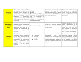 El documento describe diferentes tipos de ambientes de aprendizaje, incluyendo ambientes centrados en el estudiante, el conocimiento, la evaluación, la comunicación, el aprendizaje lúdico y los ambientes virtuales. Cada ambiente se caracteriza por las relaciones entre maestros, estudiantes, familia y escuela, y cómo apoyan el aprendizaje y desarrollo de los estudiantes.