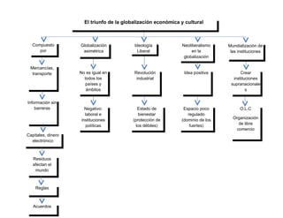 El documento analiza los aspectos positivos y negativos de la globalización económica y cultural desde una perspectiva neoliberal. Señala que la globalización ha llevado a la mundialización de las instituciones a través de organizaciones supranacionales pero de forma asimétrica, afectando negativamente al estado de bienestar y protección de los más débiles debido a un espacio poco regulado que favorece a los más fuertes.