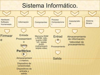 El documento describe los componentes principales de un sistema informático, incluyendo el hardware físico como la memoria RAM y ROM, la unidad de procesamiento central, las tarjetas de audio y video, y los periféricos de entrada/salida, así como el software y firmware que permiten la computación y el procesamiento de información para su almacenamiento, entrada y salida.