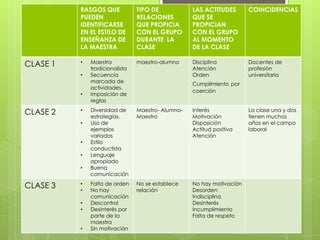 El documento resume las características observadas en tres clases impartidas por una maestra. En la primera clase, la maestra tiene un estilo tradicionalista con actividades secuenciadas de manera estricta e imposición de reglas, lo que fomenta la disciplina y atención de los estudiantes. En la segunda clase, la maestra utiliza diversas estrategias y ejemplos variados para motivar a los estudiantes y promover una actitud positiva. En la tercera clase, la maestra no establece una relación con los estudiantes