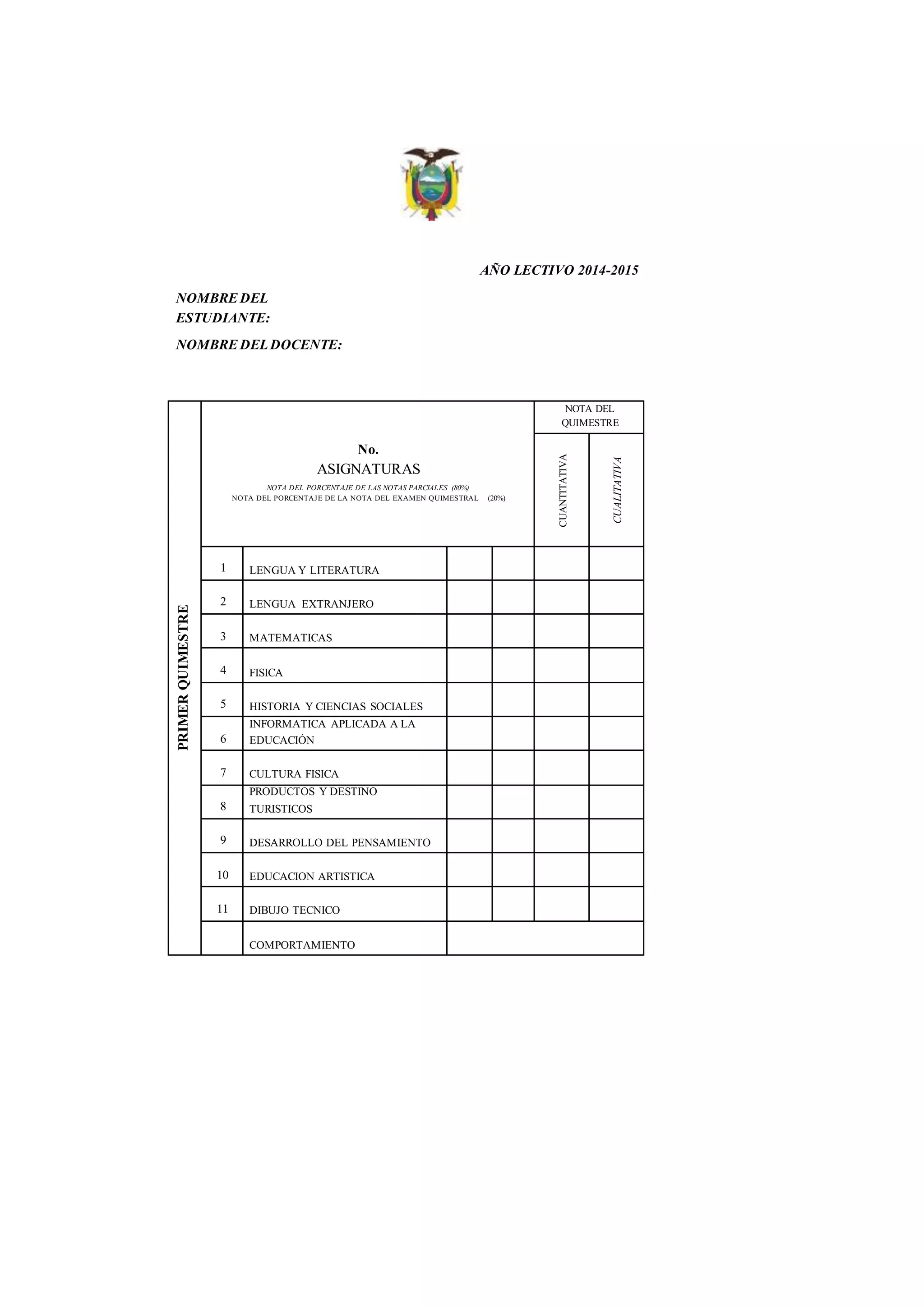 Este documento presenta un resumen de las calificaciones de un estudiante en el primer trimestre del año escolar 2014-2015. Incluye las 11 asignaturas cursadas por el estudiante, las notas parciales obtenidas en cada asignatura que representan el 80% de la calificación final, y la nota del examen trimestral que equivale al 20% restante de la calificación del trimestre.