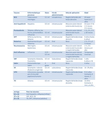 El documento detalla un esquema de vacunación para diferentes enfermedades en la infancia, especificando las vacunas, dosis, vía de administración, y edades recomendadas. Incluye información sobre vacunas como BCG, hepatitis B, pentavalente, y otras, junto con instrucciones sobre la aplicación. Además, se proporciona un formato de jeringas según las necesidades de cada vacuna.