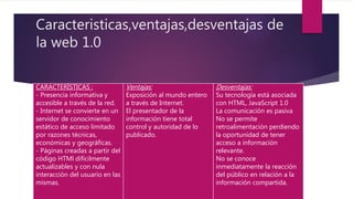 El documento describe las características, ventajas y desventajas de la Web 1.0. Las características incluyen información estática y de acceso limitado, así como páginas difíciles de actualizar. Las ventajas son la exposición mundial pero el control total del presentador de la información. Las desventajas son la tecnología limitada, comunicación pasiva y falta de retroalimentación del público.