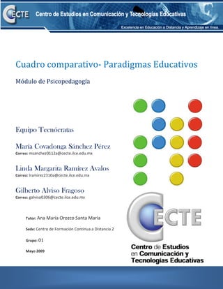 Este documento presenta un cuadro comparativo de los cinco principales paradigmas psicopedagógicos: conductista, humanista, cognitivo, sociocultural y constructivista. Describe los principios fundamentales, líderes representativos y aportes de cada paradigma, así como el papel del docente y el alumno y los tipos de evaluación que proponen. El documento invita al lector a reflexionar sobre cuál paradigma es el más idóneo para la educación actual y qué elementos de cada uno podrían retomarse considerando los requerimientos de la