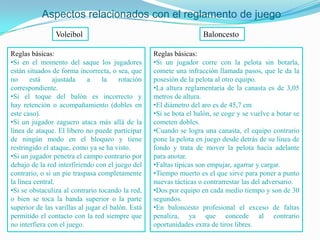Este documento compara el voleibol y el baloncesto, resumiendo sus reglas básicas, fundamentos técnicos y tácticos, y organización a nivel internacional. El voleibol se juega con una red y prohibe que el balón toque el suelo, mientras que el baloncesto se juega lanzando un balón a una canasta elevada. Ambos deportes tienen federaciones internacionales que regulan sus normas.