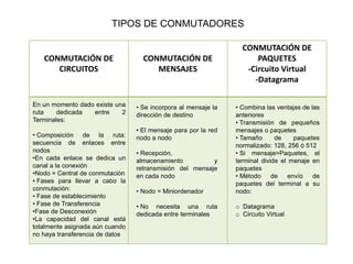 El documento describe tres tipos de conmutadores: conmutación de circuitos, conmutación de mensajes y conmutación de paquetes. La conmutación de circuitos establece una ruta dedicada entre dos terminales a través de nodos de conmutación. La conmutación de mensajes envía mensajes enteros de un nodo a otro sin una ruta dedicada. La conmutación de paquetes divide los mensajes en paquetes normalizados y los envía a través de la red sin una ruta dedicada como la conmutación de circuitos.