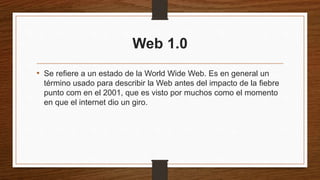 El documento describe las características de la Web 1.0, 2.0 y 3.0. La Web 1.0 consistía en páginas estáticas con contenido controlado por el creador. La Web 2.0 permitió a los usuarios participar activamente generando y compartiendo contenido a través de blogs y redes sociales. La Web 3.0 usa inteligencia artificial para encontrar información relevante de forma más eficiente a través de bases de datos semánticas, aunque la codificación semántica compleja representa un desafío.