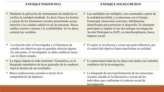 Este documento compara el enfoque positivista y el enfoque socio-crítico en la investigación. El enfoque positivista busca verificar objetivamente la realidad mediante mediciones e identificar causas y hechos, mientras que ignora los estados subjetivos. Por otro lado, el enfoque socio-crítico reconoce que hay múltiples realidades construidas socialmente y busca la emancipación a través de la investigación-acción participativa. Finalmente, el documento indica que su proyecto se alinea más con el enfoque socio-crí