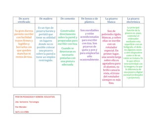 Este documento describe diferentes tipos de pizarras, incluyendo pizarras de acero vitrificado, madera, cemento, lienzo o plástico. También describe las pizarras blancas tradicionales, las pizarras electrónicas y las pizarras de polivinilo rígido. La principal función de todas las pizarras es controlar el orden y escribir con tiza, rotulador o dedo, aunque cada tipo tiene ventajas y usos específicos.