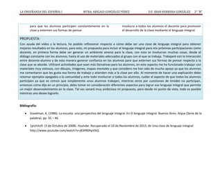 El documento presenta un video y lectura sobre la enseñanza del lenguaje integral. El video muestra a una maestra creando un ambiente ameno e involucrando materiales variados para promover la interacción, atención y habilidades lingüísticas de los estudiantes. La lectura discute la importancia de considerar diferentes recursos educativos y adaptarse a las necesidades de los estudiantes, viendo la escuela como un lugar divertido que valora a cada niño. La propuesta final propone generar un ambiente de diálogo y confianza e involucrar