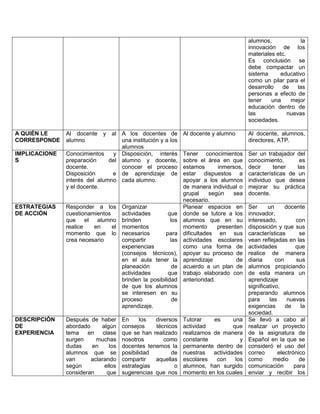 El documento presenta una tabla comparativa de cuatro categorías relacionadas con la asesoría académica: asesorar, acompañar, tutorar y gestionar conocimientos. Define cada categoría y describe sus tareas, propósitos, quiénes están a cargo, implicaciones, estrategias de acción, descripción de experiencias, resultados obtenidos, logros y dificultades.