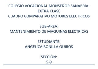 Este documento presenta un cuadro comparativo de los diferentes tipos de motores eléctricos, dividiéndolos en motores de corriente alterna (CA) y de corriente continua (CC). Describe los cuatro tipos principales de motores CA (universal, asíncrono, síncrono y de jaula de ardilla) y los diferentes tipos de motores CC (serie, compound, shunt y sin escobillas). También menciona otros tipos como el motor paso a paso, servomotor y motor sin núcleo.