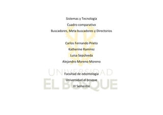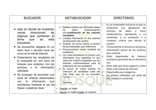 Este documento presenta una tabla comparativa de los buscadores, metabuscadores y directorios. Los buscadores muestran direcciones de páginas con el tema buscado. Los metabuscadores realizan búsquedas en varios buscadores y combinan los mejores resultados. Los directorios almacenan información sobre archivos organizados jerárquicamente por contenido.