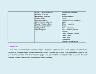 Este documento compara dos empresas de comercio electrónico, MercadoLibre y Amazon. Ambas empresas se dedican principalmente a la intermediación de compras y ventas entre usuarios a través de Internet, aunque MercadoLibre es una empresa argentina fundada en 1999, mientras que Amazon es una empresa estadounidense fundada en 1994 y también ofrece servicios en la nube. Ambos sitios ofrecen una amplia variedad de productos y permiten a los usuarios comprar y vender artículos.