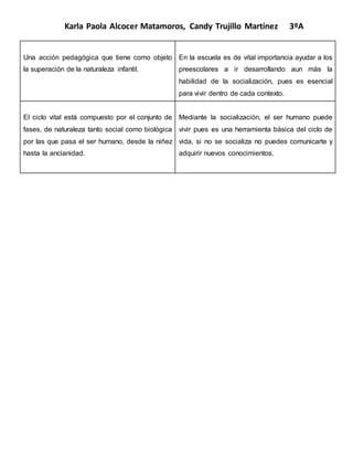 El documento discute la importancia de la socialización en la infancia y cómo afecta el desarrollo de los niños. Explica que la socialización debe comenzar en las primeras etapas de la vida para que los niños aprendan a funcionar en la sociedad. También describe cómo la familia juega un papel clave en la socialización de los niños y cómo ellos imitan el comportamiento de los adultos. Finalmente, enfatiza que la habilidad de socializarse es fundamental para que los humanos puedan vivir y comunicarse.