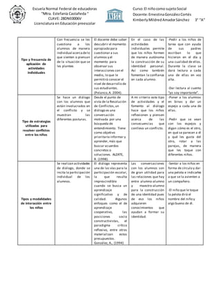 El documento describe las estrategias que una maestra utiliza para organizar el ambiente de aprendizaje, fomentar las relaciones interpersonales y la identidad personal de los niños en su clase preescolar. La maestra organiza actividades grupales e individuales frecuentes, como lectura de cuentos y discusiones. También utiliza el diálogo para resolver conflictos y promover la interacción entre los niños. Sus estrategias se basan en referentes teóricos sobre el desarrollo infantil y la importancia de un clima afectivo en el