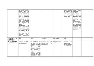 El documento compara diferentes tipos de sistemas operativos, incluyendo MS-DOS, Linux, Windows, UNIX, Solaris, OS/2 y Apple. Describe el logo, año de creación, autor, empresa patrocinadora, propósito, costo de licencia, plataformas compatibles, versiones principales y ventajas de cada sistema operativo.