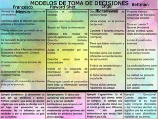 Este documento describe varios modelos de toma de decisiones de compra para consumidores. Presenta modelos centrados en la comunicación entre empresas y consumidores, así como modelos que consideran factores como la búsqueda de información, las características personales y los estímulos externos. También discute ejemplos de cómo los consumidores toman decisiones basadas en sus beneficios, opiniones racionales, o estados emocionales.