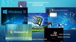 Este documento compara las características y requisitos de diferentes sistemas operativos Windows, incluyendo Windows 10, Windows XP, Windows 98, Windows 95/ME y Windows Vista. Describe brevemente los aspectos más importantes de cada sistema operativo como la armonización de experiencias de usuario en Windows 10, la interfaz gráfica mejorada en Windows XP y las características estándar introducidas en Windows 98.