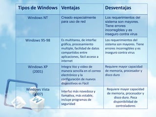 Este documento compara los tipos de sistemas operativos Windows, resaltando las ventajas y desventajas de Windows NT, Windows 95-98, Windows XP y Windows Vista. Windows NT fue creado especialmente para uso en red, mientras que Windows 95-98 permitía multitarea e interfaz gráfica. Windows XP integró voz y video de manera sencilla, e hizo más fácil la configuración de dispositivos. Windows Vista tuvo una interfaz más novedosa pero requirió mayor capacidad hardware. Todas las versiones tuvieron como desventaja requerir