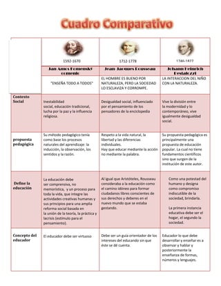 Este documento presenta un cuadro comparativo de tres importantes pensadores pedagógicos: Jan Amos Komenský, Jean-Jacques Rousseau y Johann Heinrich Pestalozzi. Resume sus contextos sociales, propuestas pedagógicas, definiciones de educación, conceptos del educador y del hombre, así como sus principales aportes a la pedagogía.