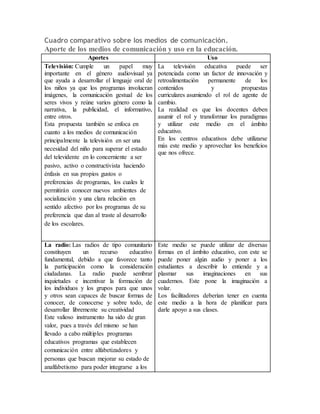 El documento compara los aportes y usos de varios medios de comunicación en la educación, incluyendo la televisión, la radio, el cine y el vídeo. La televisión ayuda a desarrollar el lenguaje oral de los niños y puede ser una herramienta de innovación educativa si los docentes la utilizan adecuadamente. La radio constituye un recurso educativo fundamental a través de programas educativos y alfabetización. El cine puede llevar temas reflexivos a las aulas para orientar comportamientos. El víde