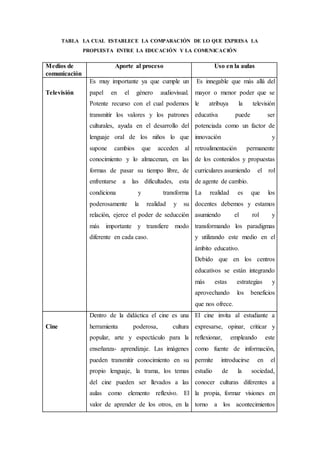 Este documento compara el aporte de diferentes medios de comunicación (televisión, cine, radio, video, computadora y fotografía) al proceso educativo y su uso en las aulas. Explica que cada medio puede ser una herramienta útil para la enseñanza si se utiliza de manera adecuada, ya que motivan e involucran a los estudiantes en sus aprendizajes de forma dinámica y creativa.