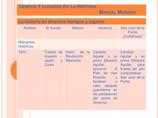 La historia es el estudio del pasado y cómo los eventos se desarrollaron en diferentes tiempos y lugares. Los historiadores analizan documentos, registros y artefactos para comprender mejor los acontecimientos históricos y cómo influyeron en la sociedad. El libro explora cómo los tiempos y lugares afectaron el desarrollo de la civilización humana a lo largo de los siglos.