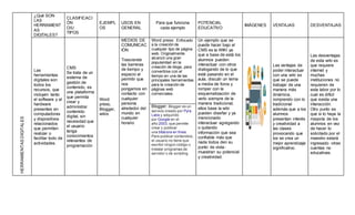 Las herramientas digitales incluyen software y hardware que permiten realizar actividades. Algunos ejemplos son CMS como WordPress para crear contenido web, redes sociales como Facebook y YouTube para comunicarse, y editores multimedia como Picasa y Canva para editar imágenes y videos. Estas herramientas pueden usarse para mejorar la educación al permitir la interacción y publicación de contenido de una manera dinámica y creativa, aunque requieren guía para asegurar un uso educativo adecuado.