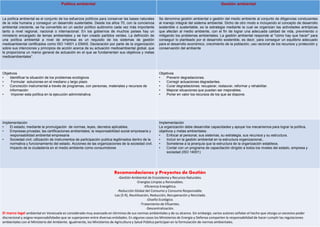 El documento compara la política ambiental y la gestión ambiental. La política ambiental se refiere al conjunto de esfuerzos políticos para lograr un desarrollo sostenible y conservar los recursos naturales. La gestión ambiental se refiere a las estrategias y acciones para organizar las actividades humanas de forma que se logre un equilibrio entre el desarrollo económico y la protección del medio ambiente. Tanto la política como la gestión ambiental buscan prevenir y mitigar los problemas ambientales a través de la implementación de normas, cert