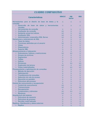 Este documento presenta un cuadro comparativo de las características de Oracle, SQL Server y DB2. Todas tres bases de datos soportan herramientas para el diseño y consulta de bases de datos, así como variaciones de SQL como tipos de datos definidos por el usuario y vistas. Sin embargo, cada una tiene características únicas como el soporte de DB2 para extensiones de índices, la capacidad de SQL Server para analizar consultas, y las herramientas de administración específicas de cada base de datos.