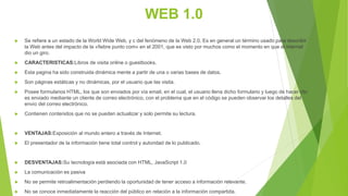El documento compara la Web 1.0, 2.0 y 3.0. La Web 1.0 consistía en páginas estáticas que solo permitían lectura. La Web 2.0 introdujo características dinámicas y colaborativas que permitieron la participación de los usuarios. La Web 3.0 se centra en la inteligencia artificial y las redes semánticas para distribuir y encontrar información de manera más fácil y rápida.