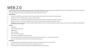 La Web 1.0 se refiere a la World Wide Web antes del impacto de la "fiebre punto com" en 2001. Era estática y no permitía interacción del usuario o actualizaciones. La Web 2.0 permite a los usuarios interactuar y colaborar generando contenido dinámico. La Web 3.0 se refiere a la evolución futura hacia una red semántica con inteligencia artificial que permita búsquedas más inteligentes.