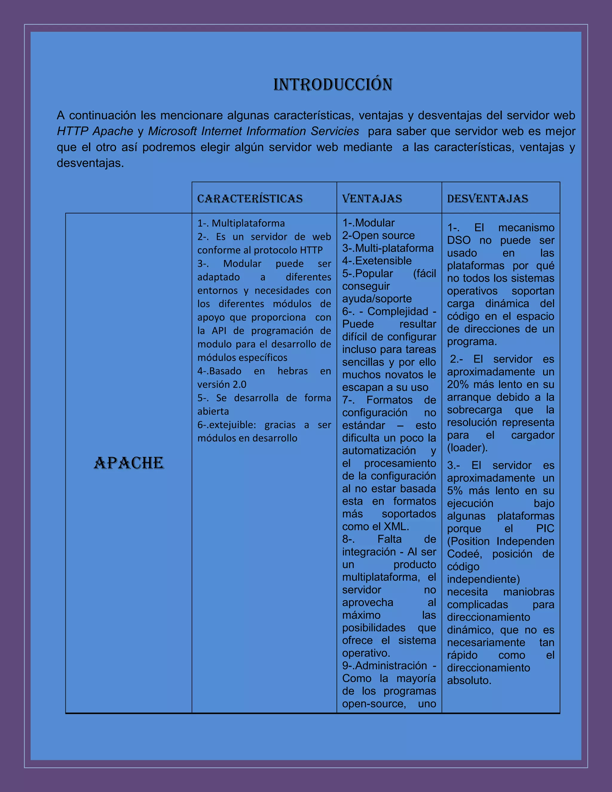 El documento compara las características, ventajas y desventajas de los servidores web Apache HTTP y Microsoft IIS. Apache es de código abierto, multiplataforma, modular y extensible pero puede ser complejo de configurar. IIS solo funciona en Windows pero proporciona capacidades de servicio web y es confiable y administrable. Ambos son buenas opciones pero Apache tiene más ventajas generales mientras que IIS es mejor para entornos Windows.