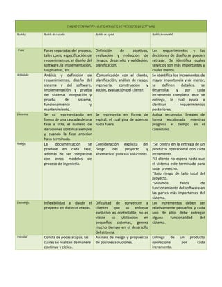 El documento compara tres modelos de procesos de software: el modelo en cascada, el modelo en espiral y el modelo incremental. El modelo en cascada divide el proyecto en distintas fases lineales como especificación, diseño e implementación. El modelo en espiral enfatiza la evaluación de riesgos y la comunicación con el cliente. El modelo incremental se centra en la entrega de funcionalidades por incrementos para obtener beneficios tempranos.