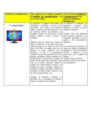 El documento analiza el uso de diversos medios de comunicación en las aulas de la República Dominicana, destacando la televisión, la prensa, el vídeo, el cine y la radio como herramientas educativas. Aunque se reconoce su potencial en la enseñanza, se identifica una implementación insuficiente y deficiencias en su uso didáctico en las instituciones educativas. Se concluye que, a pesar de los avances tecnológicos, los métodos tradicionales aún predominan en el sistema educativo dominicano.