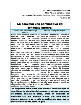El documento discute el enfoque del lenguaje integral en la enseñanza del español. Describe cómo una maestra usa materiales manipulables para atraer a los estudiantes y cómo la lectura es fundamental para desarrollar habilidades lingüísticas. También enfatiza la importancia de crear un ambiente de confianza para que los estudiantes participen y aprendan de una manera funcional en su vida diaria.