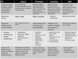 El documento describe varios modelos de desarrollo de software, incluyendo RUP Mobile-D, cascada incremental, prototipos evolutivo, RAD y XP. RUP Mobile-D es una metodología estándar para el desarrollo de software móvil que sigue un enfoque ágil e iterativo. Los modelos cascada incremental y prototipos evolutivo combinan enfoques iterativos con el desarrollo en etapas secuenciales. RAD y XP se enfocan en ciclos de desarrollo extremadamente cortos con interacción frecuente con los