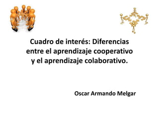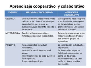 Este documento compara el aprendizaje cooperativo y el aprendizaje colaborativo, destacando sus diferencias en objetivos, metodologías, principios, roles del instructor y estudiantes, ambientes, motivación, procesos, aportes individuales, desarrollo personal, productividad y tendencias pedagógicas. El aprendizaje cooperativo se centra más en la construcción guiada de ideas con la ayuda del instructor, mientras que el aprendizaje colaborativo enfatiza más el desarrollo humano a través de la contribución individual al objet