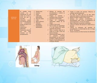 El documento compara tres procedimientos invasivos: el sondaje vesical, el sondaje nasogástrico y el sondaje rectal. Para cada procedimiento, se describe brevemente el concepto, los materiales necesarios, el procedimiento y los cuidados de enfermería requeridos.