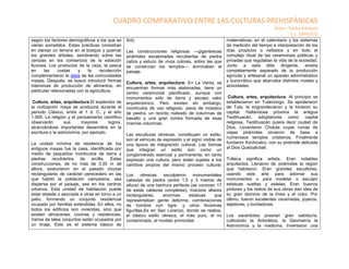 El documento compara las culturas prehispánicas maya, azteca y tolteca. Todas tenían gobiernos monárquico-teocráticos donde los dioses gobernaban la vida de las personas y estas vivían para alabarlos. Los mayas se ubicaban en el sur de México y practicaban agricultura, caza y pesca. Su esplendor ocurrió entre los años 1 d.C. y 1000 d.C., logrando avances en escritura y astronomía. Los aztecas se ubicaban en el centro de México y