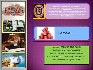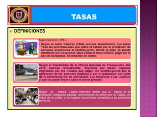 El documento aborda el concepto y características de las tasas en el contexto del derecho tributario en Venezuela, definiéndolas como contribuciones por la prestación de servicios específicos del estado. Se clasifica y diferencia las tasas de otros tributos, señalando su carácter proporcional al beneficio recibido. Asimismo, se resalta su importancia como contraprestación económica vinculada a servicios públicos divisibles y cuantificables.